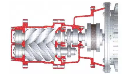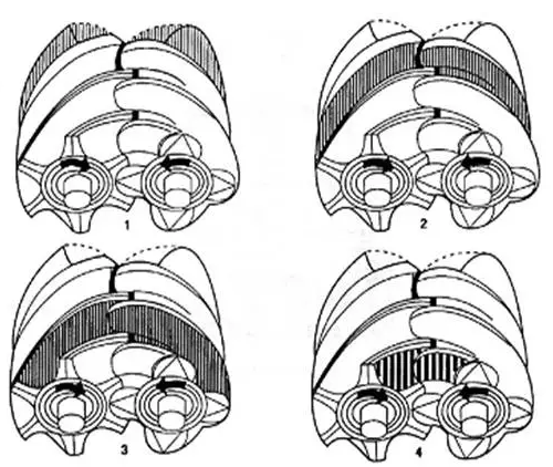 我們以螺桿空壓機(jī)為例,螺桿壓縮機(jī)的工作循環(huán)可分為進(jìn)氣,壓縮和排氣三個(gè)過程。隨著轉(zhuǎn)子旋轉(zhuǎn),每對(duì)相互嚙合的齒相繼完成相同的工作循環(huán)。
