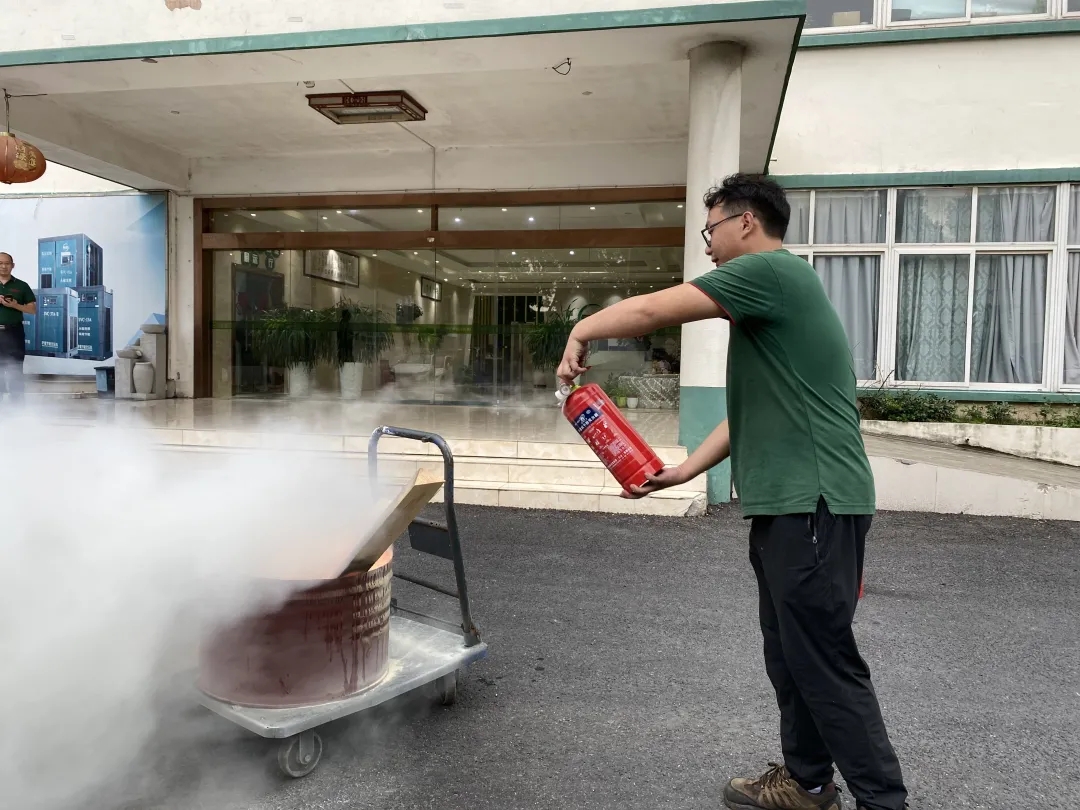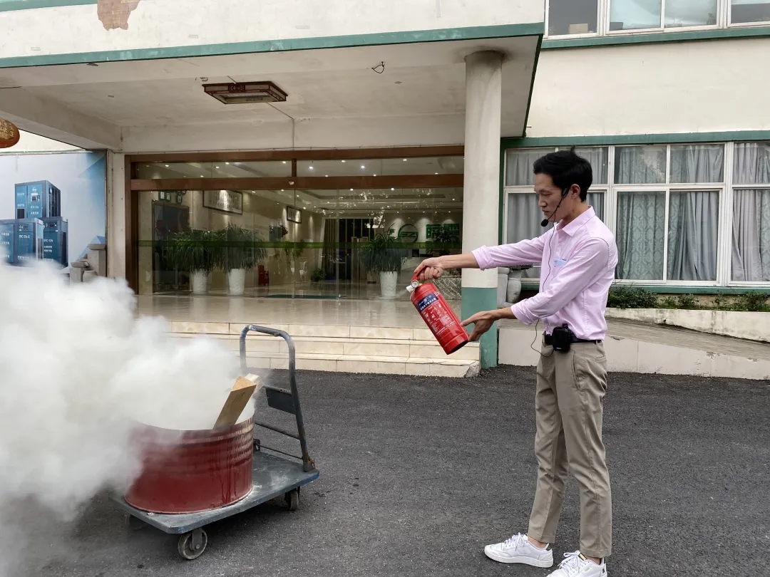 薩震節(jié)能空壓機余滔介紹了火災應急知識及正確的逃生方法,并對滅火器的正確使用,找準最佳滅火點進行了詳細的講解與現(xiàn)場的規(guī)范操作。