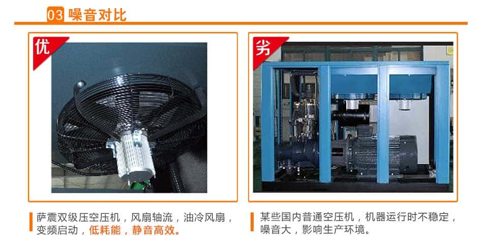 采用薩震空壓機(jī)主機(jī),無振動(dòng),低噪音,大轉(zhuǎn)子,低轉(zhuǎn)速,強(qiáng)大的心臟決定了整機(jī)的優(yōu)異性能。轉(zhuǎn)子經(jīng)嚴(yán)格的動(dòng), 靜平衡試驗(yàn), 使其運(yùn)轉(zhuǎn)平衡更好, 振動(dòng)更小, 噪聲更低,同時(shí)在直徑不變的情況下,轉(zhuǎn)子長度增加,有效壓縮面積增加,從而達(dá)到流量增加,功耗降低。